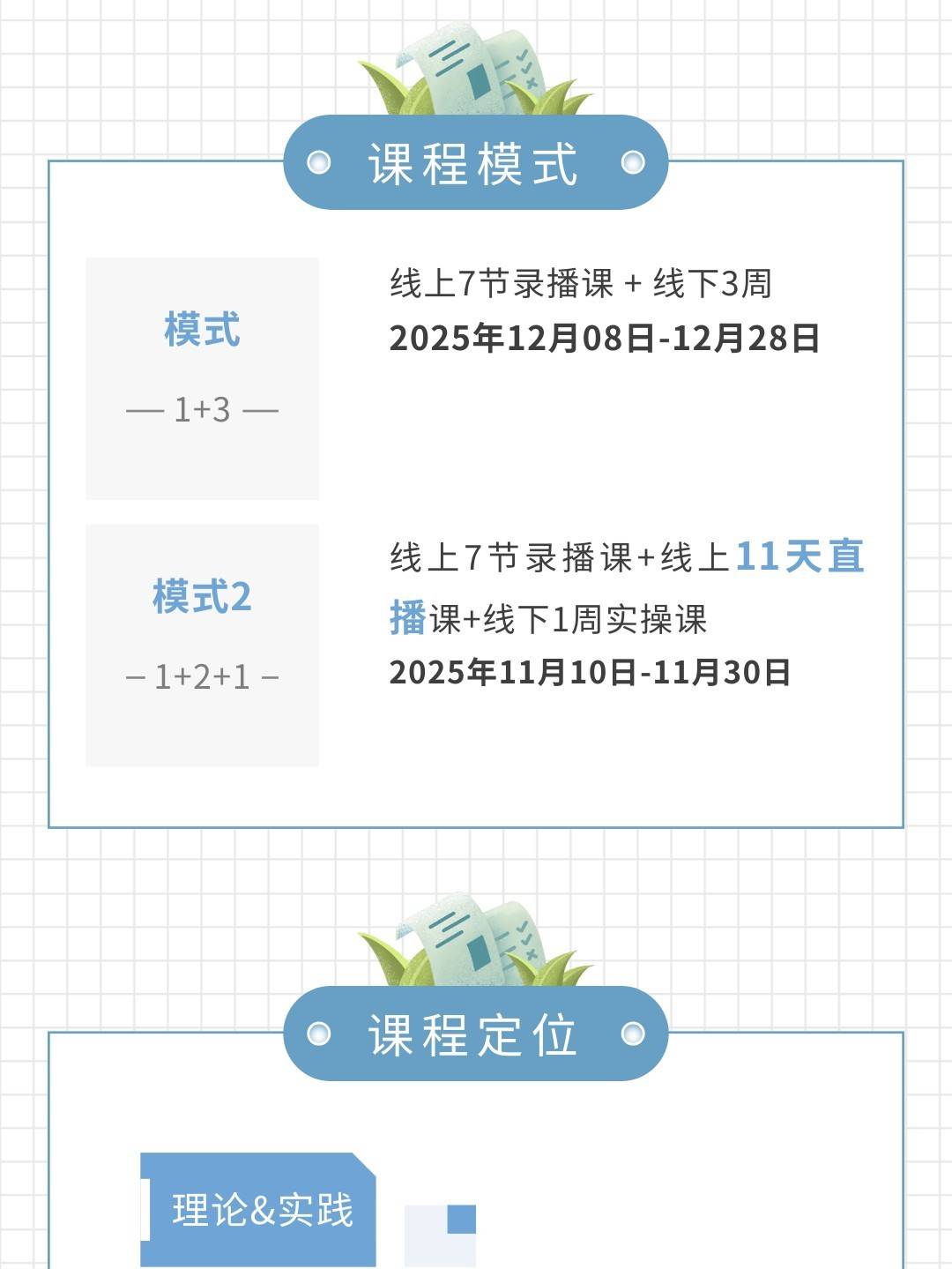 本期学习流程:线上 7节 基础视频课+线上2周直播+线下1周实践 学习考核