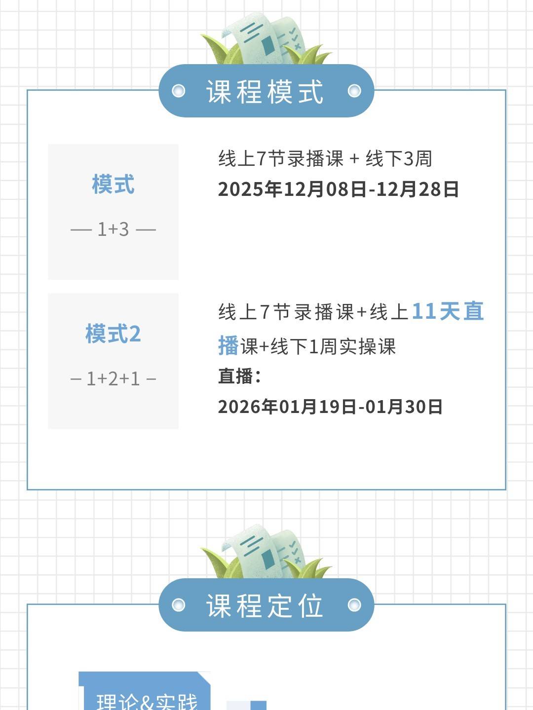 本期学习流程:线上 7节 基础视频课+线上2周直播课+线下1周实践 学习考核