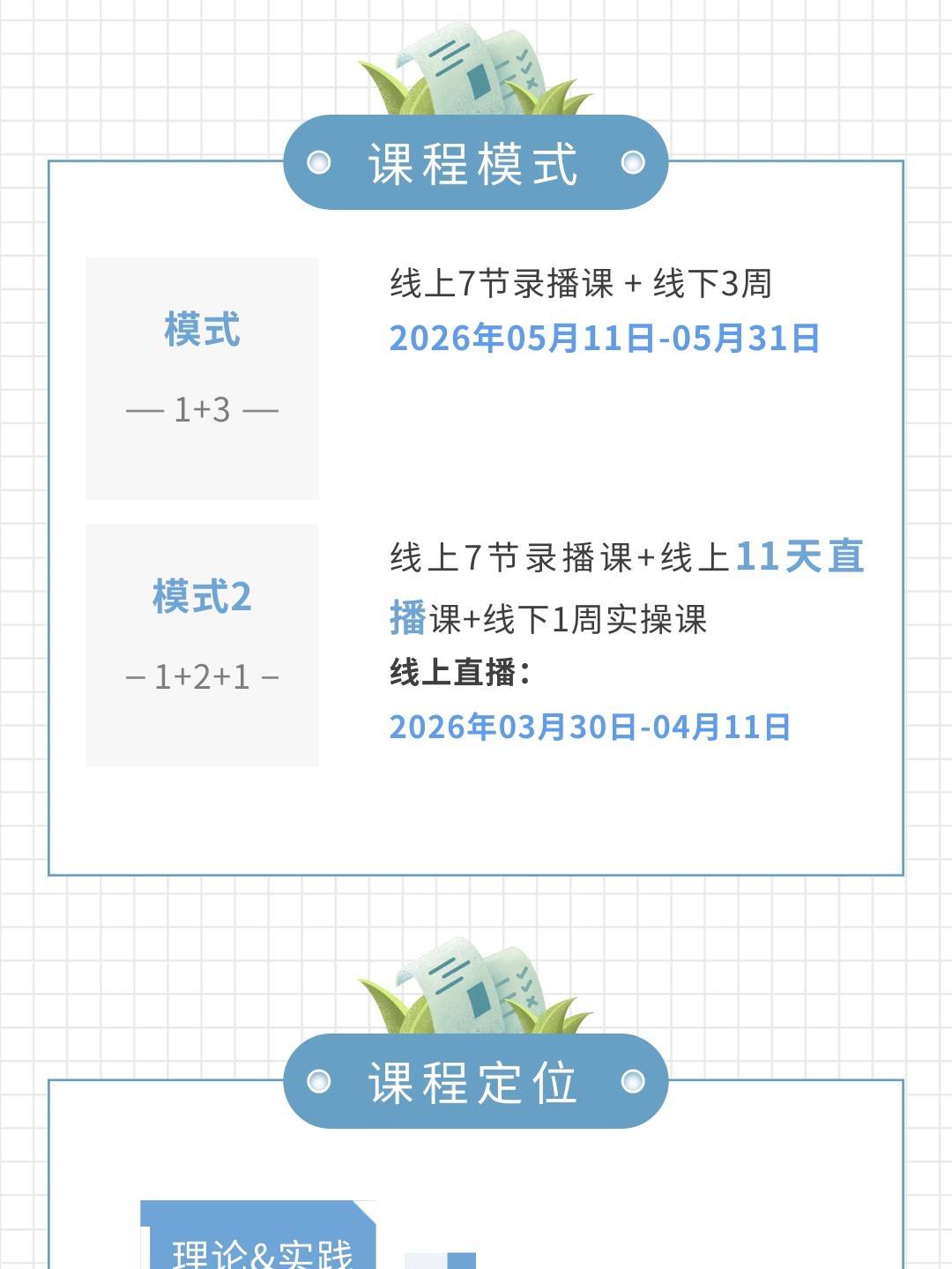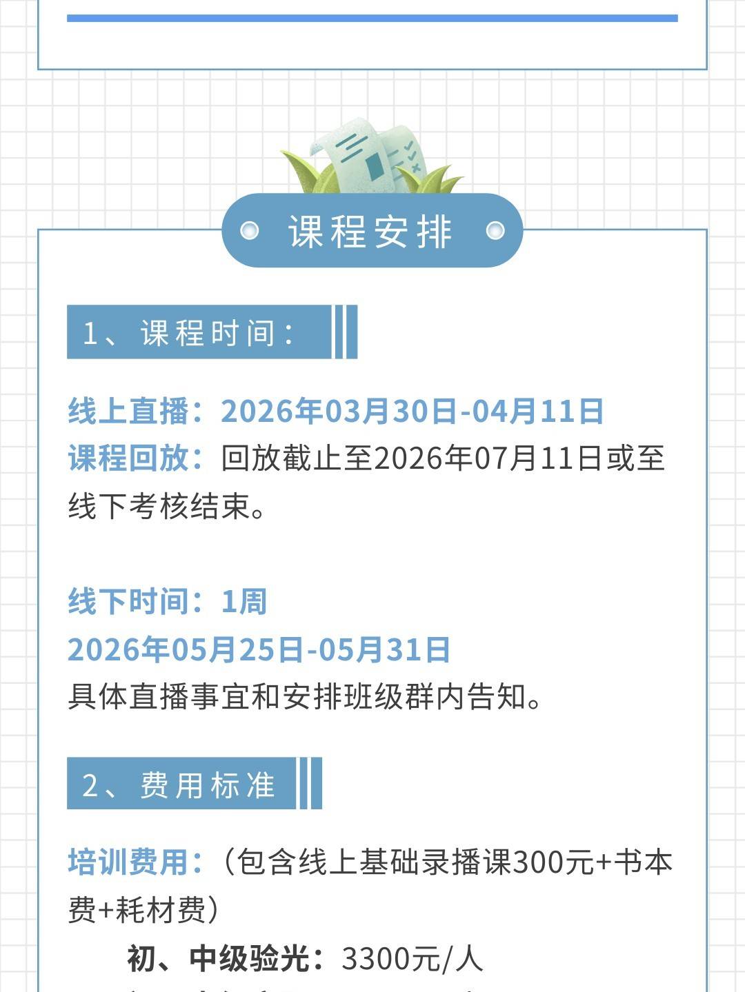 本期学习流程:线上 7节 基础视频课+线上2周直播+线下1周早中晚实践 学习考核